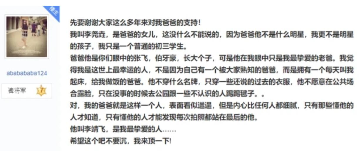 在女儿眼里,李靖飞是很好的父亲。2014年,上初三的李尧垚发文,表示父亲每天叫她起床,给她做饭,“表面看似邋遢,但是内心比任何人都细腻”。