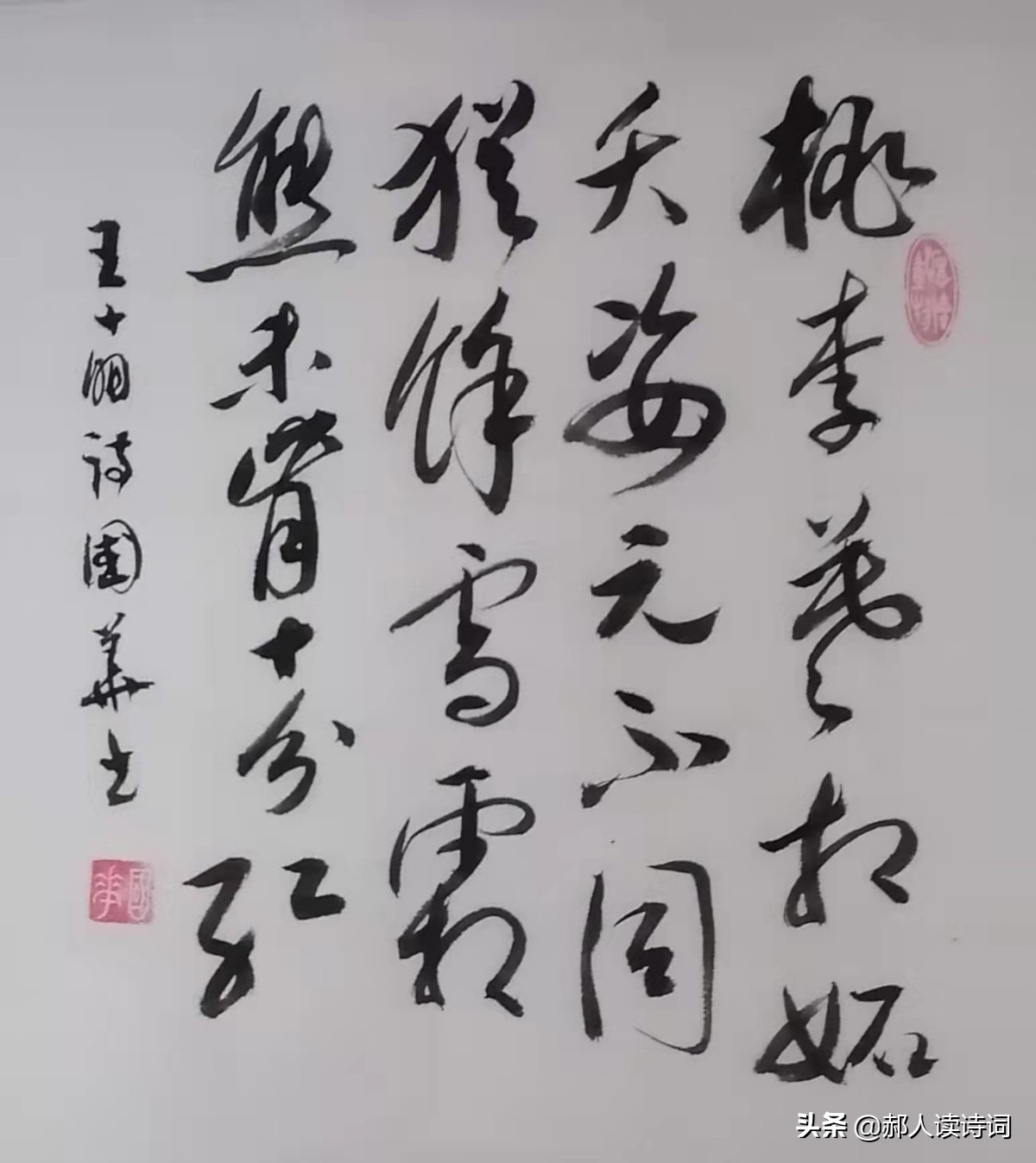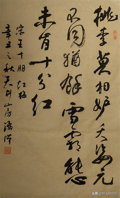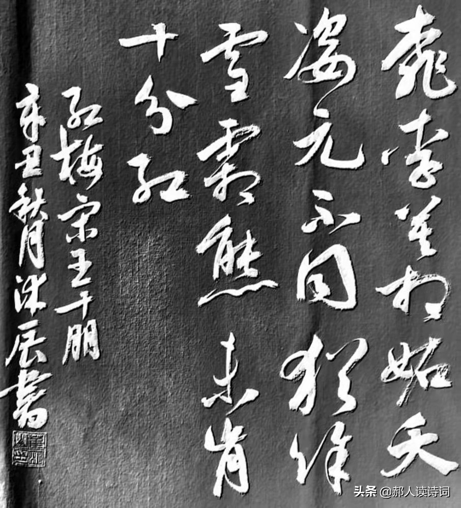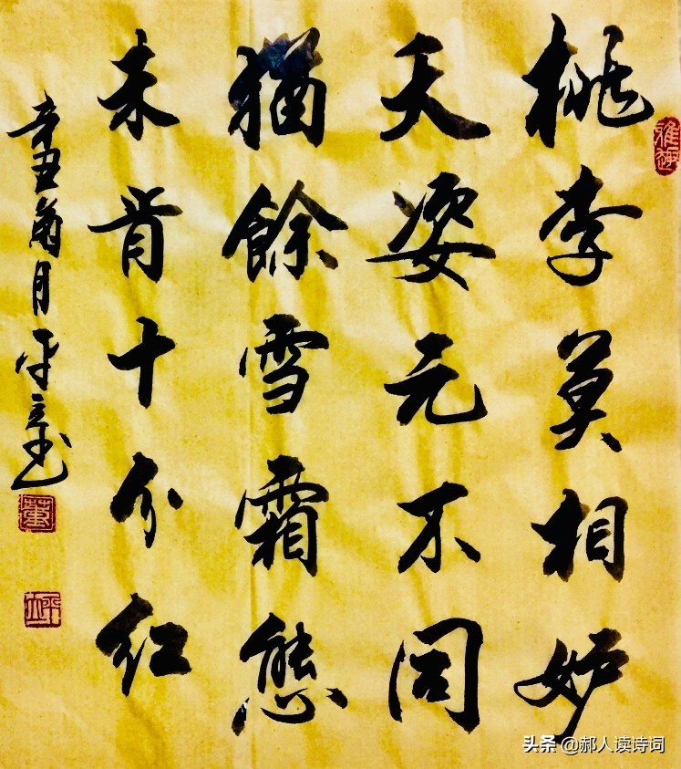 桃李不要嫉妒凛冬绽放的红梅,花与花开放的姿态原来就不同。经历了风雪,身上还有雪的痕迹。虽然是红梅,色彩却不是十分红艳。