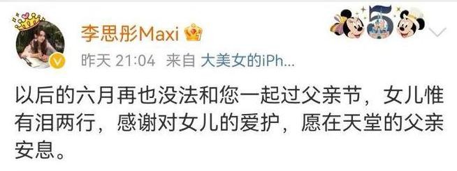 同时,李思彤也在微博发文缅怀父亲:“以后的六月再也没法和您一起过父亲节,女儿惟有泪两行,感谢对女儿的爱护,愿在天堂的父亲安息。”