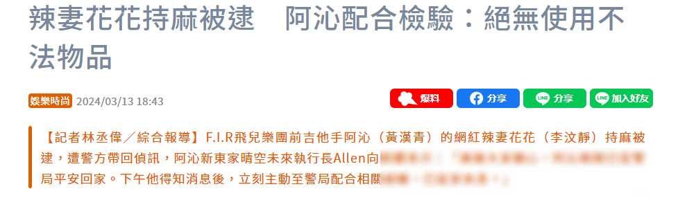 近日,港台媒体报道称,知名网红阿沁之妻花花(李汶静)因涉毒而被警方逮捕。据了解,警方已于当晚将其转移至律警署,花花衣着随意、头发凌乱且未化妆,显得十分狼狈。此事件引起了国内广大网民的关注,迅速登陆热搜榜。然而在网络的热门评论区,大多数网友对这对夫妇表达了负面态度,部分人甚至提及了阿沁与前乐团成员詹雯婷曾经的感情纠葛。