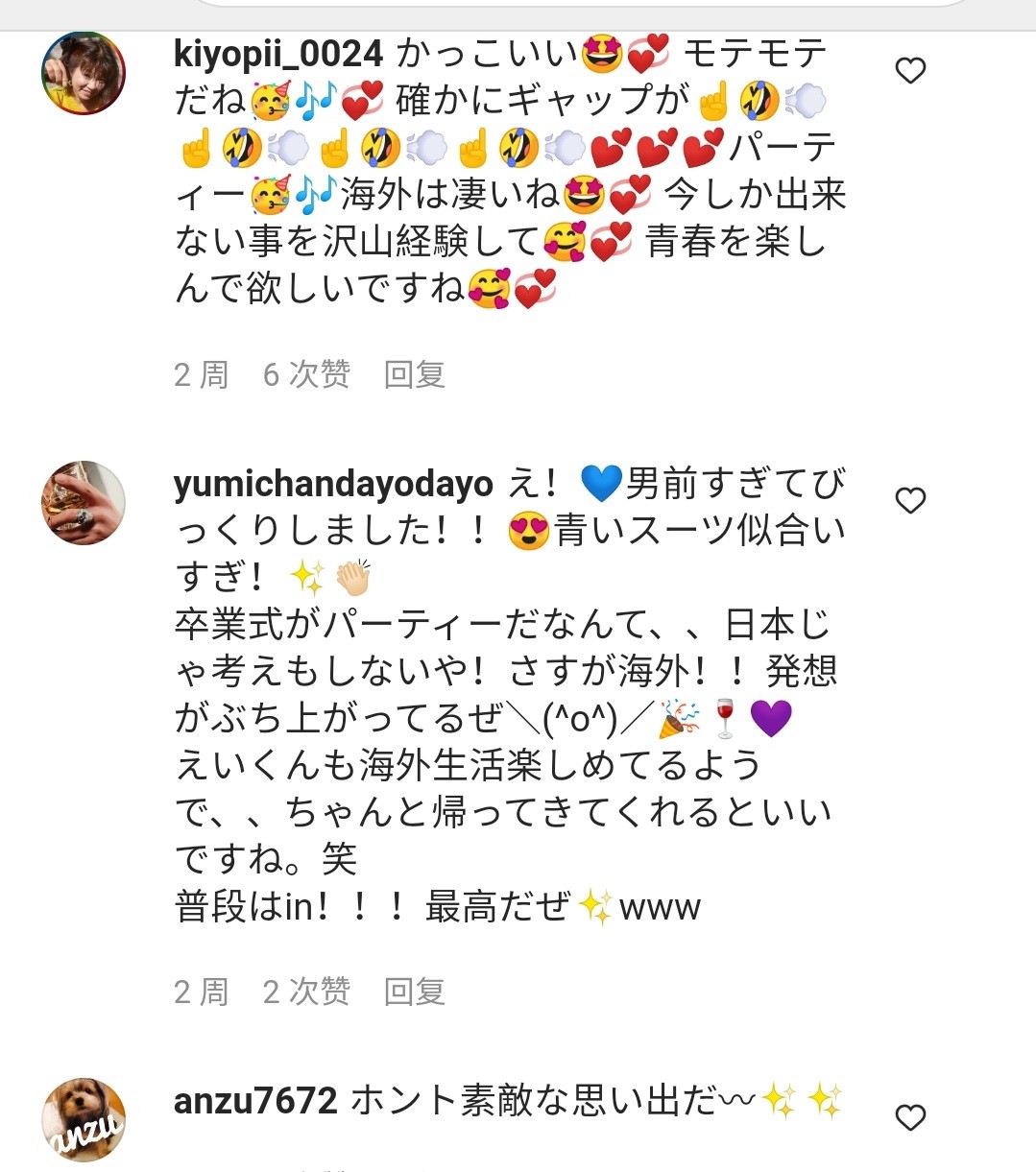 因此不少日本网友纷纷给鹤野刚士留言道,“蓝色西装太般配了,和父亲长得很像,很有男子气概呢、还以为是哪里的年轻帅哥演员,原来是咏斗君,成长为了一名很棒的青年,开始露脸的话就是演艺圈出道了吧?建议子承父业。”