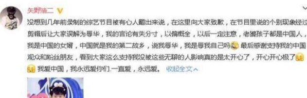 有些网友把这个话题大题小做,觉得矢野浩二是在吐槽中国人没有素质,甚至一些网友觉得矢野浩二有“辱华”倾向。12.月4日下午,矢野浩二就此事在微博中道歉了,他承认自己言论有失分寸,以偏概全。他表示自己是中国女婿,老婆孩子都是中国人,中国是自己的第二故乡。