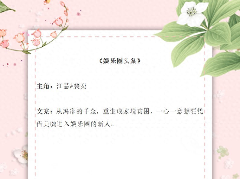 书评:小编最喜欢的娱乐圈小说之一,女主本是名门千金,生活本来没有意外就是嫁人生子,却意外重生成为了贫困家庭高三女生江瑟。重生后的江瑟努力考取最好的大学,最开始为了学费,后来因为兴趣,进了娱乐圈,成为了一名演员,是真的将演员当事业,最后凭借天赋与智慧,成为了影后。男主裴奕是女主身为名门千金是的竹马,从小就几乎明恋女主,在女主灵魂换到江瑟身上后,也很快的认出了女主,最后终于得偿所愿,和女主幸福的在一起啦!