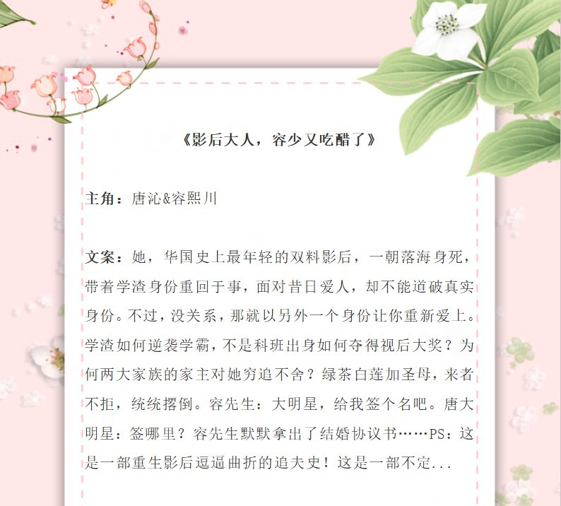 书评:聪明机灵俏皮女主vs霸气情深占有欲超强男主。重生娱乐圈女王和国民男神一起走花路的故事,超级好看,强烈推荐!