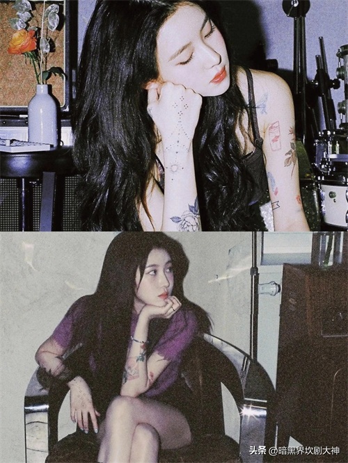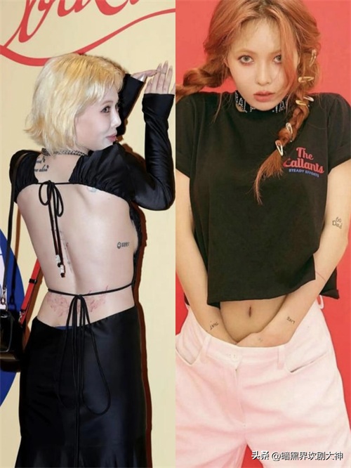 2. 泫雅:她身上有许多纹身,包括背部、肩部、手臂等部位。她的纹身风格多样,有些是小巧可爱的图案,有些则是比较夸张的设计。