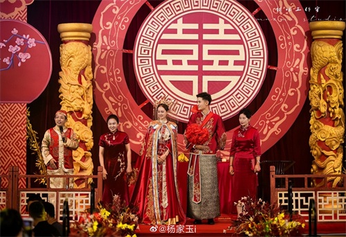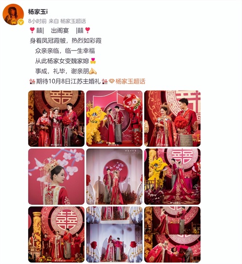杨家玉写道:“众亲亲临,临一生幸福,从此杨家女变魏家媳。事成,礼毕,谢亲朋。”杨家玉身披一身红色的中式婚纱,非常漂亮。当然,老公魏新猛也是相当帅气,可以说2人是郎才女貌。根据杨家玉的消息,2人还会在10月8日江苏进行主婚礼。