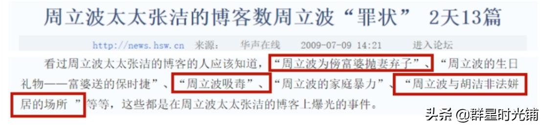 张洁不甘心这样被抛弃,在网络上曝光了周立波的真实人品:遇见女富婆后抛弃家庭,冷暴力逼她离婚,还放出了周立波吸d的证据,一时间舆论一片哗然,面对舆论周立波再次用他的口才扭转了局面,他把张洁放出的证据解释为自己喝多了而不是吸d,指责张洁炒作。