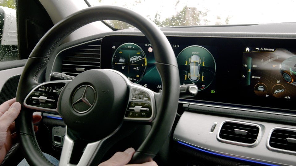我们前往GLE越野赛。奔驰越野车GLE和GLS有三种不同的4MATIC系统。在四缸发动机中,是一种永久的全轮驱动系统,其固定分配为前轴50%,后轴50%。从六缸发动机和插电式混合动力版GLE开始,这是一个完全可变的按需扭矩系统,扭矩在前轴和后轴之间按需分配,从零到100%。
