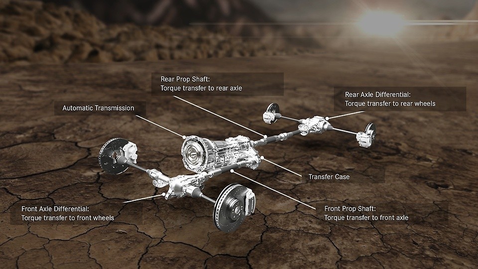 在动力系统中,分动箱直接位于自动变速器上,将驱动力传递给两个轴和所有四个车轮。