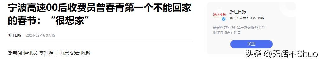 原文登载于浙江日报 2024年2月16日关于宁波高速00后收费员曾春青第一个不能回家的春节:“很想家”