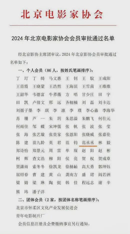 近期,范丞丞的名字赫然出现在了北京电影家协会的会员名单中。