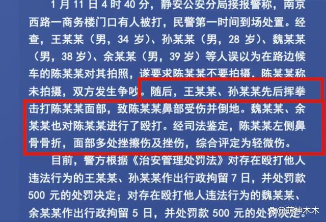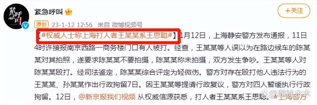 此前,上海静安警方发布通报,称 1 月 11 日 4 时左右接到报警,在南京西路一栋商务楼门口,有路人被打。通报当中,透露以王某某为首的一群人和路人发生了争执,最开始,王某某认为路人在偷拍他们,随后进行交涉,但整个过程中,路人一直强调自己并未对其进行偷拍,双方发生了不愉快。从一开始的口角之争到之后出现了推搡,王某某等人对陈某某实施了殴打行为。