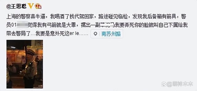 事实上,王思聪之前曾经与警方之间有过不愉快的事儿,2014 年,王思聪发博称,原本聚餐酒后找代驾回家,遭遇临时检查,因发现其车上有弓箭,被警方带走调查。王思聪当时非常不满,发博飙脏话怒斥对方,还曝光了对方的照片和警号。
