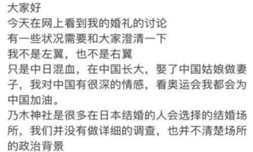 首先是对自己的身份进行了一定的解释,并不是左翼也不是右翼,只是普通的中日混血。自己的妻子是中国人,对于中国也是有一定的深厚情感的,甚至是奥运会也会为中国加油。而对于网友所说的在乃木神社,则是日本的常用婚礼场所,对此没有做详细的调查,所以针织背景也是不知道的。
