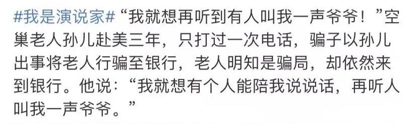 就像有很多老人被骗买保健品、去银行汇款,甚至有个别老人明知是骗局,还宁愿往坑里跳,为的不过就是有人能说说话。