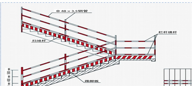 楼梯口在扶手处应设两道防护栏杆并刷警示色,高底不低于1200mm,中间杆距地面500—600mm,竖杆间距不大于1800mm。楼梯口处应设照明设施(使用安全电压),确保通行所需的光线照度。新建工地采用定型楼梯节点钢构件。接头处用钢套管连接,使用膨胀螺栓固定。