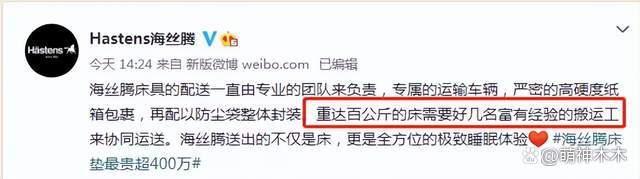 其实,在大 S 退还床垫一开始,就有网友猜退的是假货,还遭到了官方品牌的倒油。品牌一开始发文称他们家的床垫有上百公斤重,需要几位专业的搬运工人,大 S 那边放出的画面只有两个工人,看起来很轻松的样子,就很假。