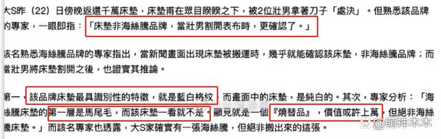 有熟悉该品牌的专家从切割画面中一眼看出真相,称床垫并非百万品牌,百万床垫的第一层是马尾毛,这个切割的床垫并不是,它是替代品,价格或许有上万块,跟汪小菲的 200 万没得比。还有这款百万床垫标志性的特征就是蓝白格纹,画面中的床垫属于是纯白。