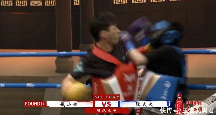 比赛开始之前,张大大就带上了护具,而钱小佳什么都没有,看来张大大是真的怕被打。比赛开始之后,张大大尝试主动出击,但他的拳法明显有点无力,和他平时展现出来的形象也差不多。相比之下钱小佳打得比较有力,张大大只能是节节败退。