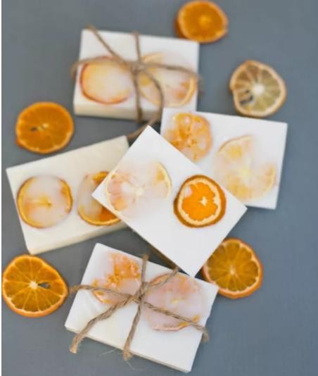 这款柑橘香皂制作工艺简单,可以预先混合,只需一点定制,就可以成为手工艺品。制作过程中无需使用任何化学物质,如碱液,只须融化和倾倒两个步骤。干燥的柑橘片是关键,因为它们不是新鲜的,但它们确实有相当清爽的气味。柑橘切片很重,因此请在基底稍微冷却后再添加,防止切片会掉落到模具的底部。只需找到融化的山羊奶并倒入基料,然后加入柑橘精油和干橙片,即可。