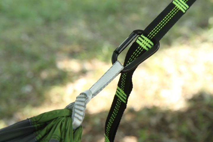4、将吊床两头的挂扣分别扣在两棵树的绑带的环上,根据距离调节吊床的松紧,使吊床处于略为松弛的状态,以便穿杆