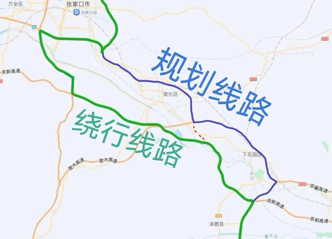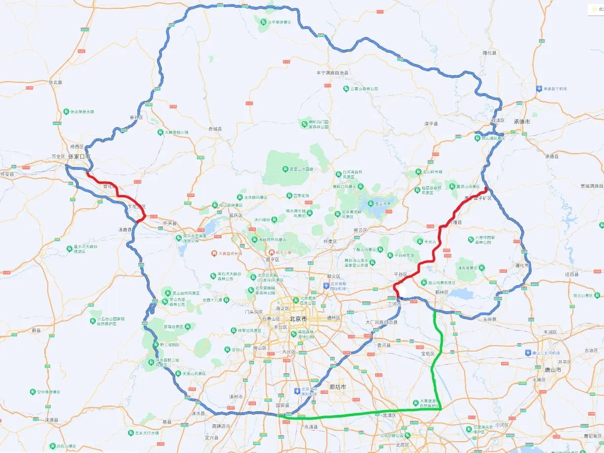蓝色绕行线路,红色原规划线路,绿色绕出北京线路