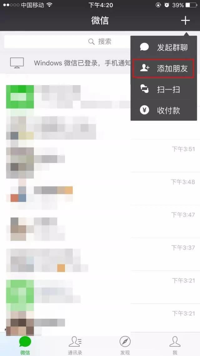 一、打开微信,选择右上角,点击添加朋友;