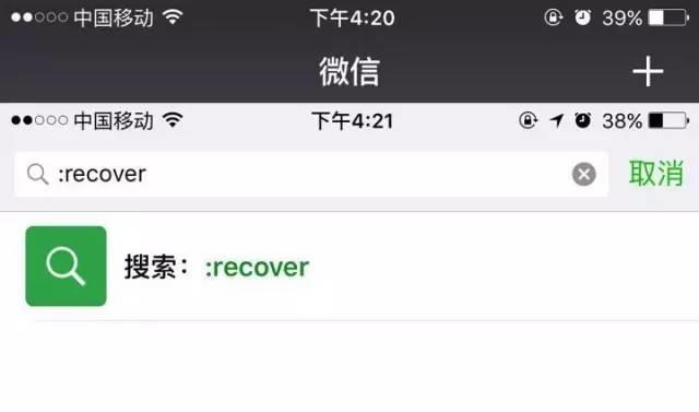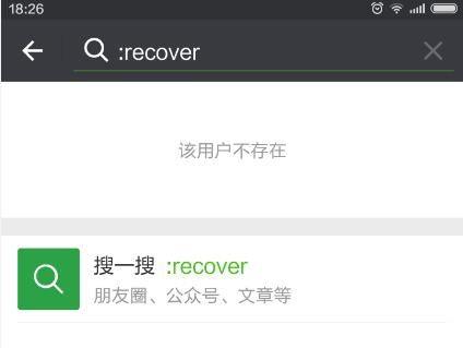 二、将输入法切换至英文状态,在搜索框里输入“:recover”;(不要忘记前面的冒号“:”哦)