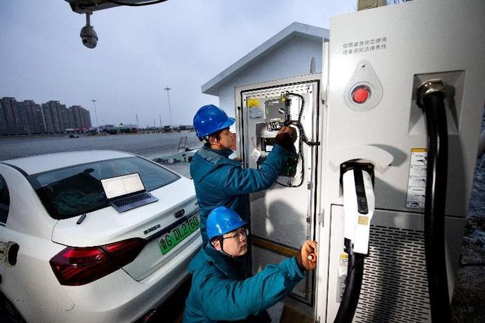 2月4日,国网淄博供电公司工作人员维护高速公路服务区充电桩,服务春节返乡车主及时充电。远德亮摄
