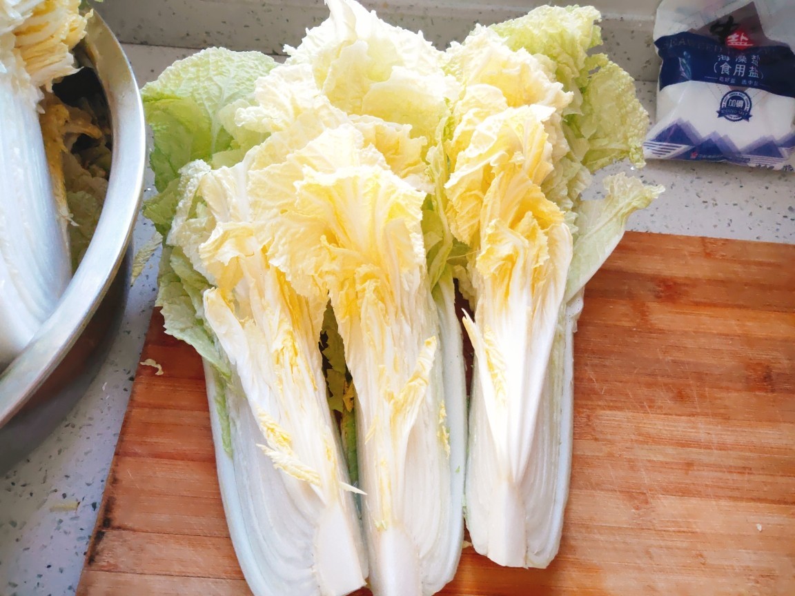 1、白菜脆爽的关键,就在于腌出水分,可以多放点盐,至少也要4个小时,最后冲掉咸味,攥干备用。