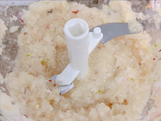 3、白菜制作好了,接下来处理腌料部分,准备一个料理机,依次放入半个洋葱、一个苹果、一个梨、5瓣蒜,3片姜,用高速档打碎,水果去核削皮,切成小块。