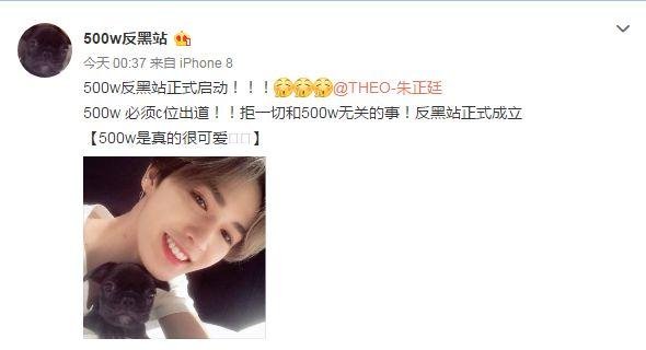 因为认同“五百万”这个名字的粉丝太多,粉丝们还隔空喊话朱正廷,狗子就叫“五百万”,后援会反黑站已经正式成立了!朱正廷的狗子“五百万”的全球粉丝后援会,和“五百万反黑站”一夜之间就正式成立了!这个时候就不得不感慨珍珠糖姐姐们的速度了,“五百万”这个名字已经被珍珠糖们集体认证,要不然朱正廷就认了这个名字,给狗子取名“五百万”好了!