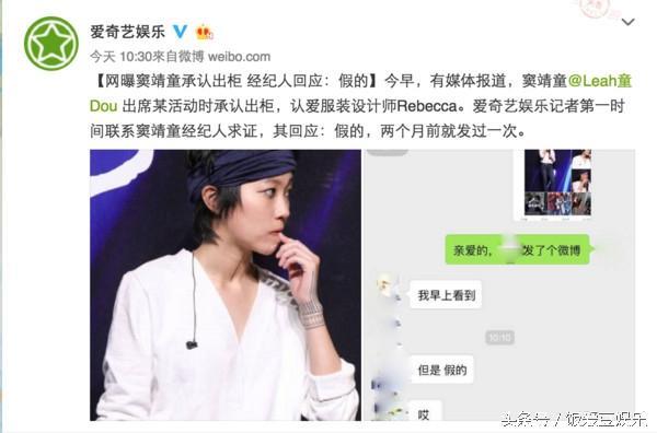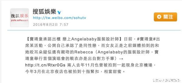根据《搜狐娱乐》报导,窦靖童在出席某活动时,公开承认自己是同性恋身份,而女友便是Angelababy的服装设计师,Rebecca。据悉,童童与Rebecca早前曾经在北京被拍到动作亲昵、咬耳朵以及疑似接吻的各种亲密举动,不过当时窦靖童已澄清双方只是好朋友。不过,《爱奇艺》指出,窦靖童经纪人回应这个新闻是假的,并说:2个月前就发过一次了。