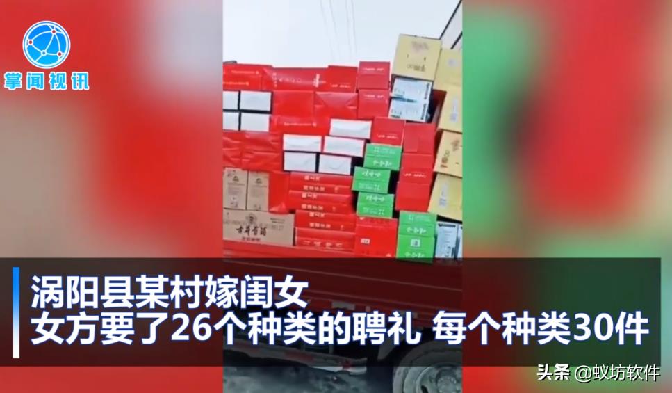 据网友爆料视频,安徽亳州涡阳县某村民嫁闺女,要了26个种类的聘礼,每个种类30件。而且这还不包括猪肉、烟花等物品,加在一起近千件聘礼,纷纷罗列在车上,整整装满一车,这阵势,让众人目瞪口呆的同时,也引来了巨大争议。不少网友惊呼:我的天哪,这是要开超市吗?