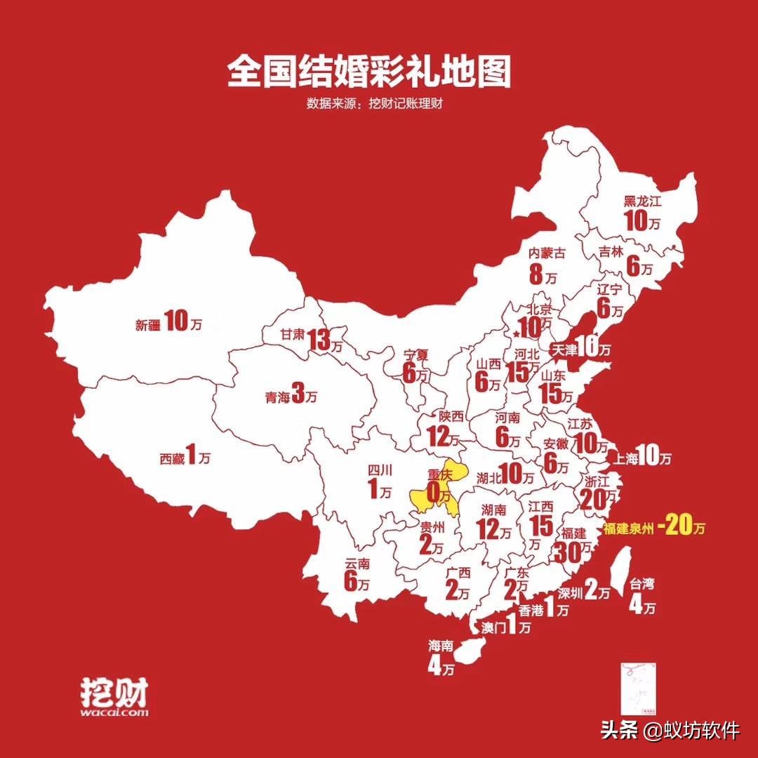 2月14日,挖财君整理的一份“全国彩礼大数据”显示,除重庆“零彩礼”及福建泉州“倒贴20万”为中国婚礼界的一股清流之外,其他地区的“女婿们”都需要提着或多或少的彩礼上门迎亲的。其中5-15万是主旋律,浙江的彩礼平均值高达20万,而福建省的彩礼更以30万的平均值成为全国之最!