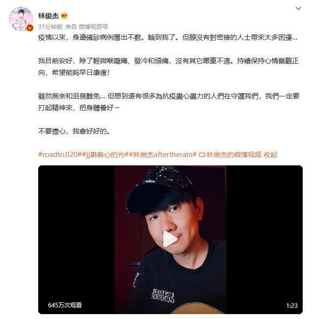 林俊杰在发文中表示,“疫情以来,身边确诊病例层出不穷。轮到我了。但愿没有对密接的人士带来太多困扰……”