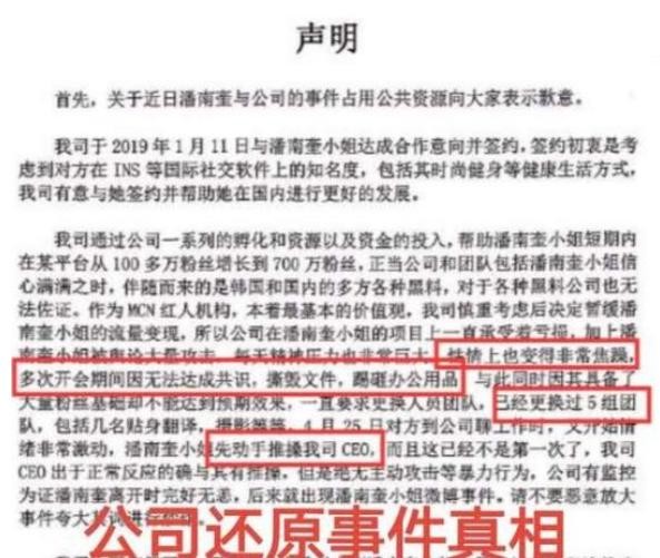 但是面对潘南奎的发言,公司却直接否认,此后公司发布声明,表示当时公司的CEO确实与她有推搡,但是并未真的主动攻击她。