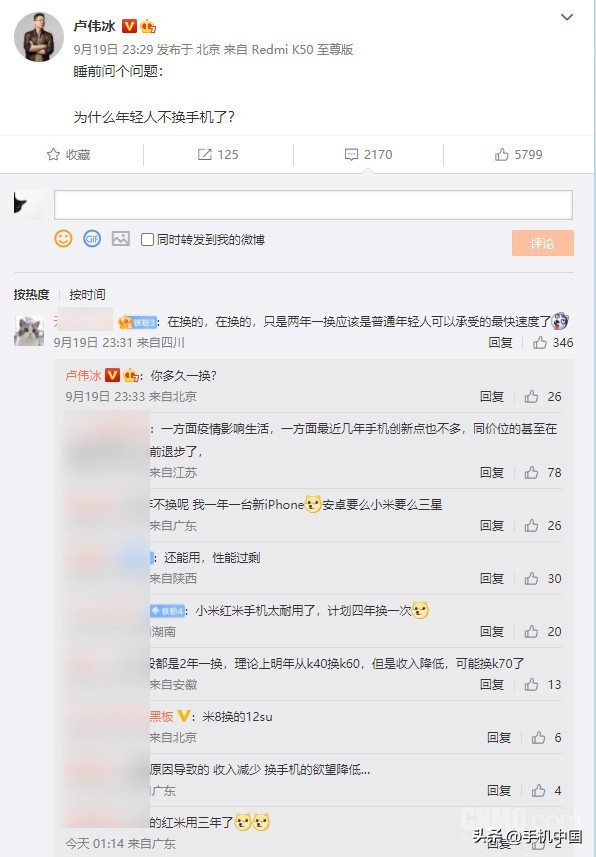 有网友表示:在换的,在换的,只是两年一换应该是普通年轻人可以承受的最快速度了。这条评论被卢伟冰翻牌了,因此互动量最高。有人回应称,一方面疫情影响生活,一方面最近几年手机创新点也不多,同价位的甚至在有些方面还比以前退步了。许多人有类似的想法,表示手里的手机还能用,性能过剩。“小米、红米手机太耐用了,计划四年换一次。”
