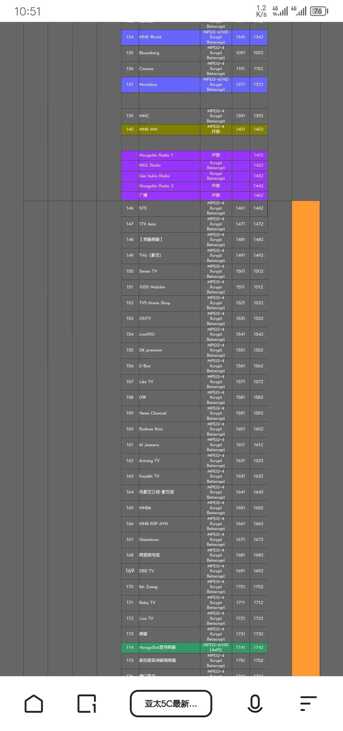 目前我看该卫星也已经退役了,取而代之的是亚太5C号卫星,该卫星正直壮年,目前看所有的电视频道视频格式都改成了MEPG4视频格式 了,对于我们其实不算是特别友好,毕竟我们现在家里压箱底的机子大部分都是只支持MEPG2视频格式的,所以想领略一下风采,还得投资一下,小编家住6楼,如果大家想领略这些节目的风采,等小编的粉丝超过1万可以给买一套设备回来接收一下大家想接收的卫星,来寻找曾经的快乐。最后附上138卫星目前的节目和卫星参数