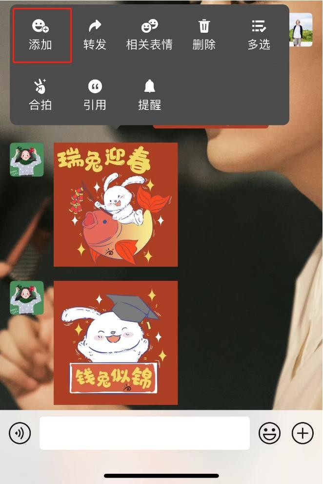 ③当然还有更简单的办法,直接发给自己或转发给好友,长按表情后“添加”即可。