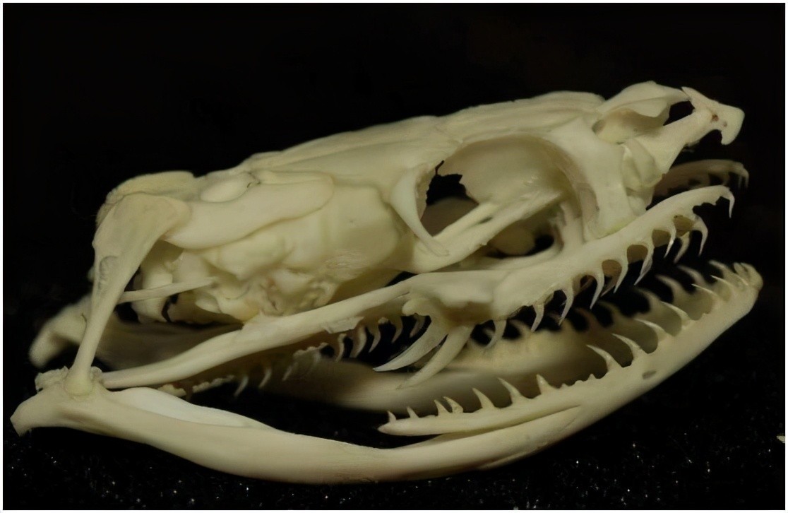 对于毒蛇来说,毒腺的大小决定了它们的排毒量,即便是毒液毒性比较高的蛇,它们也会依赖毒液量来放倒猎物,腺体产生的毒液会顺着导管由毒牙注射进猎物体内,不过对于虎斑颈槽蛇来说,这个简单的步骤实在太难了,它们的毒牙没有沟槽也不中空,毒腺和毒牙没有导管连接,甚至连毒腺都不是常规毒腺,它们的毒腺是一种被称为杜福诺氏腺体(Duvernoy′Sgland)的特殊腺体。