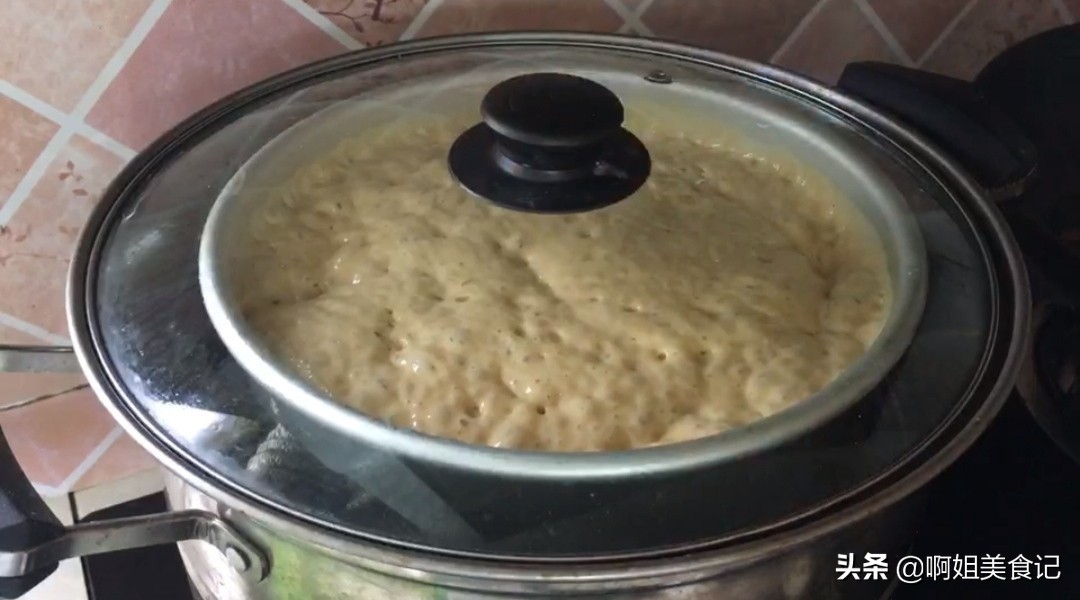 ①盆中先倒入开水,再把红糖倒进去,搅拌至红糖融化后倒入凉水,加酵母,倒入面粉和木薯淀粉。
