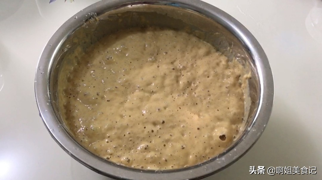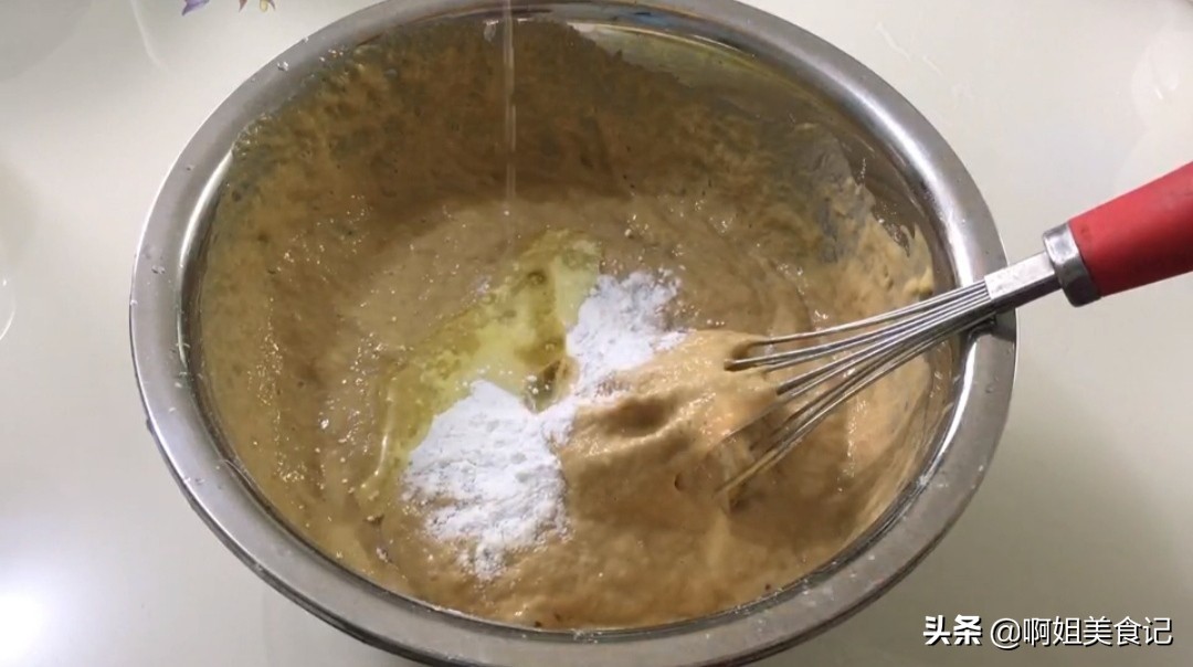 ③面糊醒发至两倍大有很多小气泡,再次搅拌排出里面的空气,然后加泡打粉和玉米油搅拌均匀。