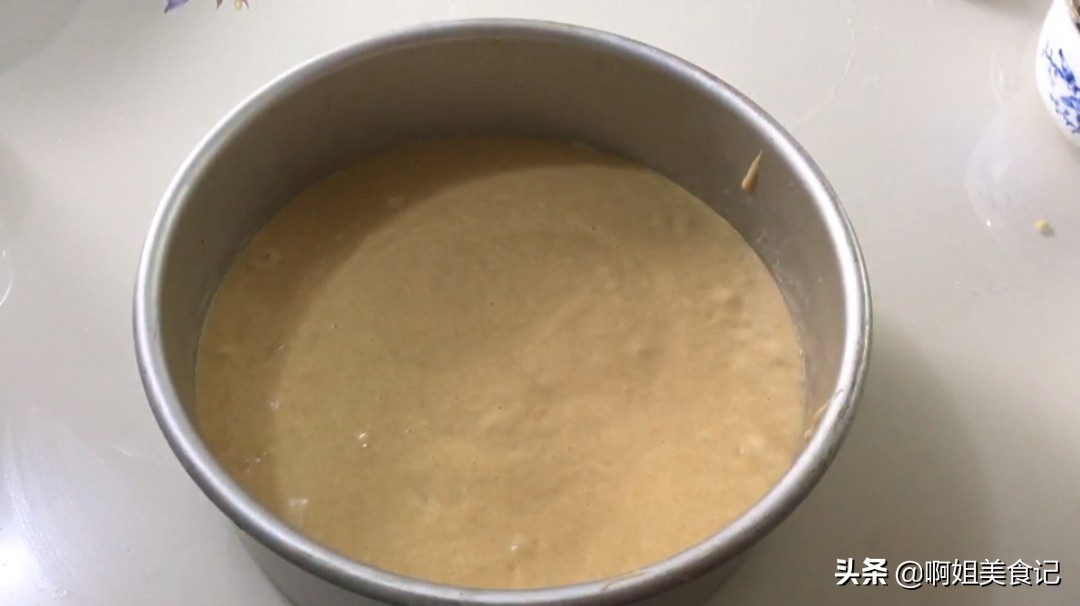 ④搅拌好的面糊倒入八寸的模具中,震出里面的气泡,二次醒发40分钟。(模具的底部和周围记得抹上一层食用油)