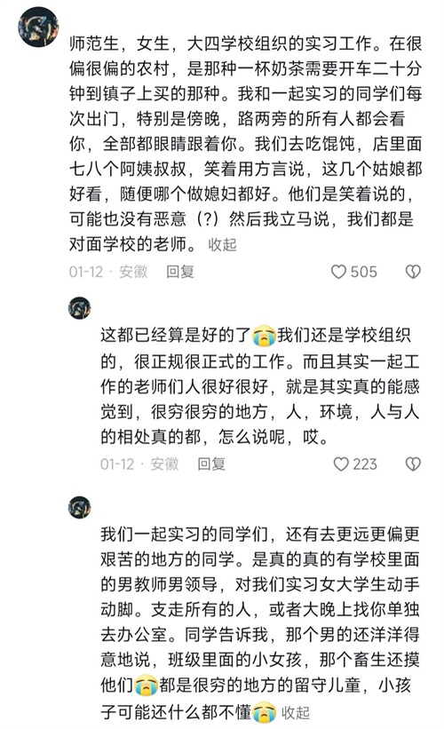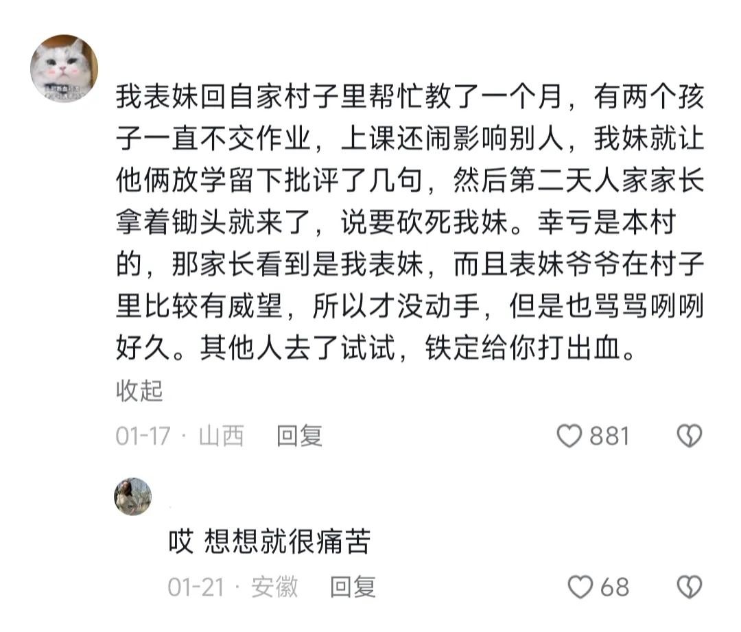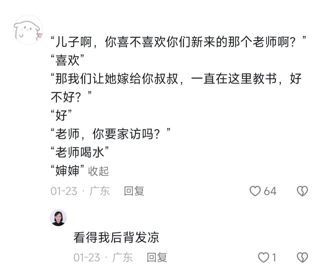 而且这些地方的人往往一点法律常识都没有,他们不觉得把支教女生强迫嫁给村里老光棍有什么问题,就算有人觉得有问题对于他们来说一个女生的人生被毁掉也远远没有被村子里其他人一起孤立来的后果严重,而且可能还觉得如果自己站出来才是害了同村人无子无后,很可怕。