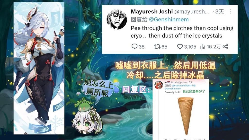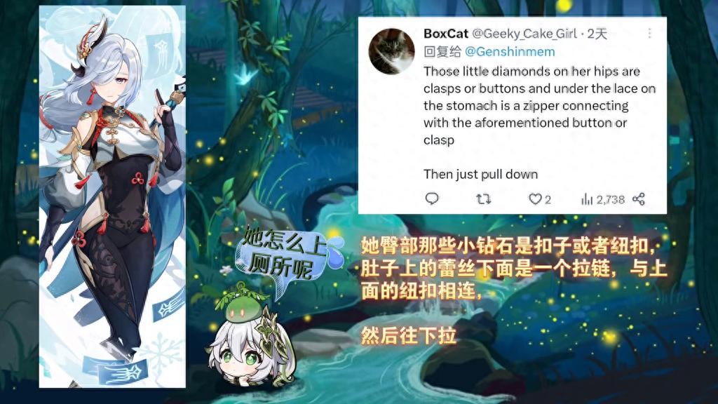 在现实生活中,这样的款式通常会贴心得设计有一个专门的开裆扣,以便于上厕所时更加方便自如。为了尽可能还原游戏中的人物形象,博主还精心挑选了两侧高开叉款式的网纱泳衣,刚好对应申鹤腹部的效果,再搭配一件半透明的白色披肩,既充满了时尚性感,观赏度也是直线上升。然而在下定决心想去上个厕所时,却有网友告知了实情:原神中申鹤是天上飞的仙人,据传闻,一些神仙,可以利用仙力毫不费力地翱翔在空中或是随风飘荡;更夸张的说法是,他们甚至能利用仙力将污物化作无痕。最后你想拥有一位像申鹤这样的小姨妈?
