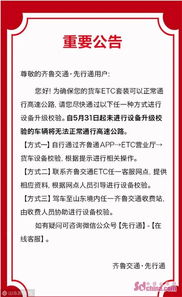 ETC客服中心通过后台数据分析,筛选出5500余条线上自主申请不规范的货车客户信息,充分利用现代化通讯媒介,通过移动运营商群发短信、人工逐一电话联系等方式,对客户进行全覆盖触达,告知客户需对ETC设备进行升级效验,并在微信公众号发布升级公告、货车设备校验流程视频教程等信息,同时要求每名员工转发朋友圈,引导客户自主修正信息,效验设备,并附齐鲁交通菏泽分公司所属各收费站、服务区、县区ETC客服网点地址及联系方式,方便客户咨询,现场办理。截至目前,5500余条不规范信息,已全部触达客户。