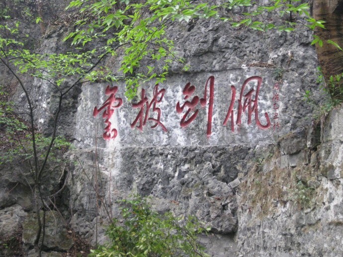 闻钟声,除烦恼;赏石刻,陶性情。听过钟声,再欣赏东山寺的石刻壁题,脑海中就有了东山寺文化的深刻印记。东山寺的16处石刻壁题,本身就是一个文化走廊,它的书法百花齐放,它的内容常常记载了一段不寻常的历史。其中,清同治乙丑(公元1865年)年间军门提督赵达庵驻军于此时所题的“佩剑披云”字大如斗,笔力遒劲,醒目壮观;民国时期织金县长王佐题刻“出岫云蒸”圆润浑厚,笔法欧苏。还有多处小字石刻,亦足供观瞻和研究。