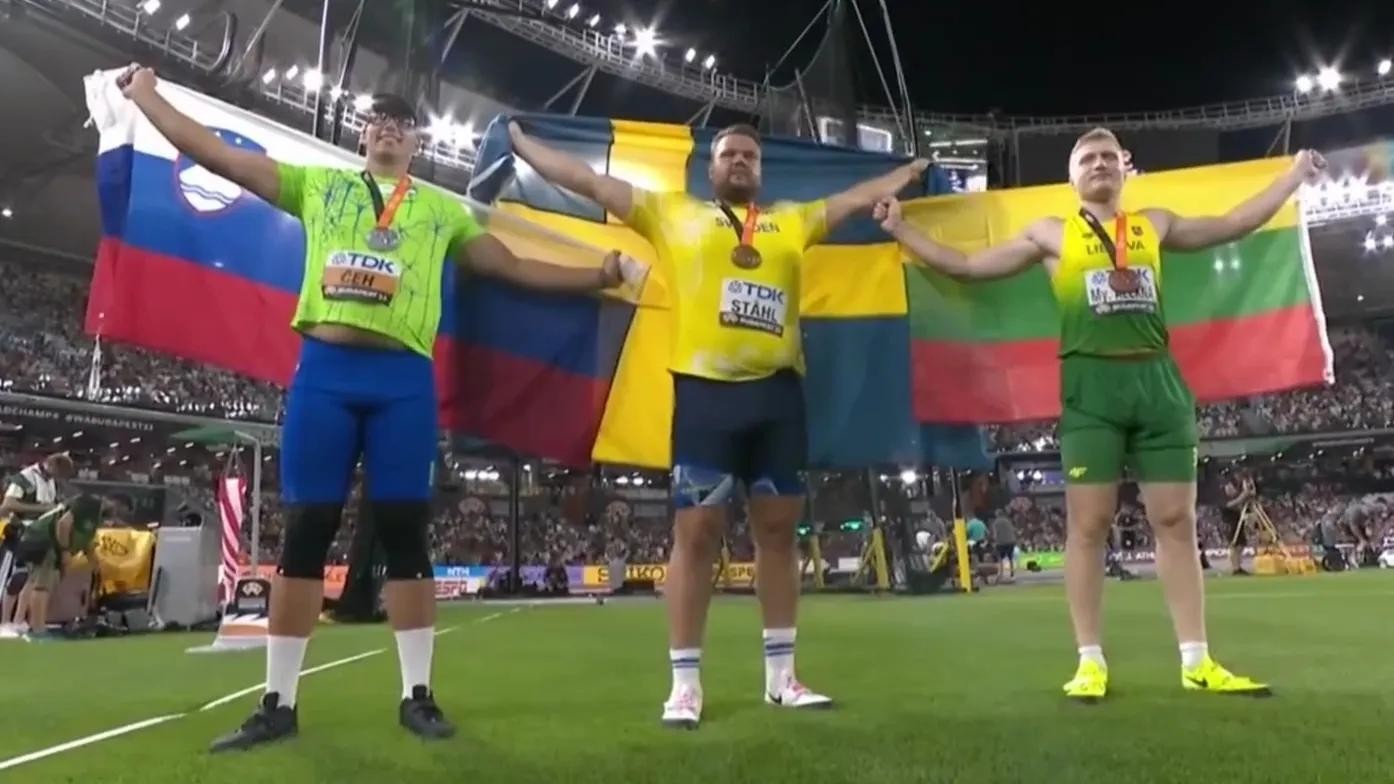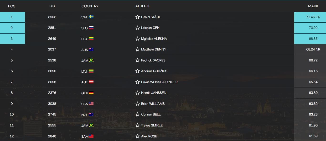 男子铁饼决赛竞争相当激烈,切赫最后一掷逆转冲到第1名,没想到斯托尔同样迎来爆发突破创造新的锦标赛记录夺冠。最终成绩是瑞典选手斯托尔71米46夺得金牌,斯洛文尼亚选手切赫70米02摘得银牌,立陶宛选手阿莱克纳获得铜牌。