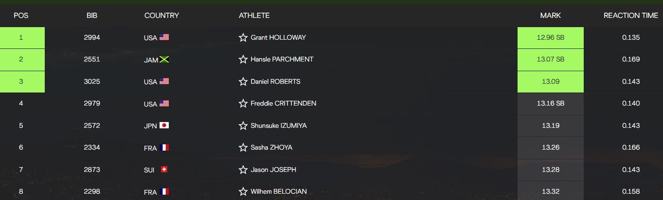 男子110米栏决赛美国选手霍洛威以12秒96的成绩夺得金牌,从起跑他就保持极佳的节奏处于领跑位置,后续冲刺阶段也没给到对手任何的机会一举拿下冠军,这也是绝对实力的象征。牙买加选手汉斯勒帕吉门特13秒07摘得银牌,美国选手丹尼尔·罗伯茨获得铜牌。